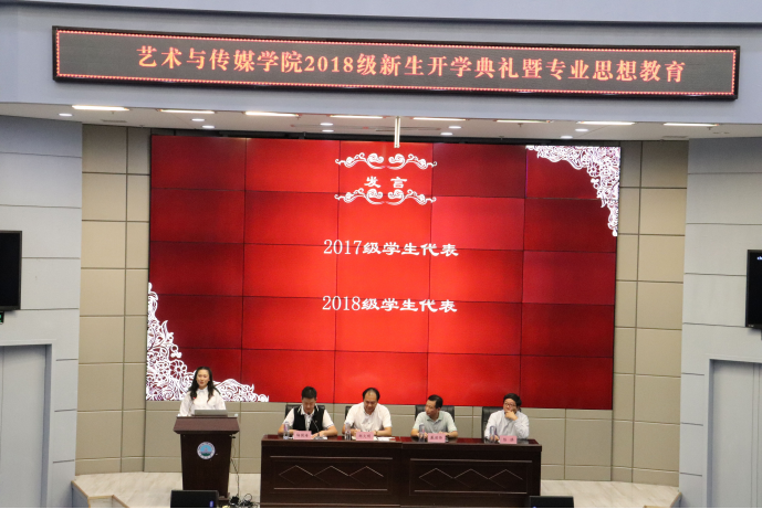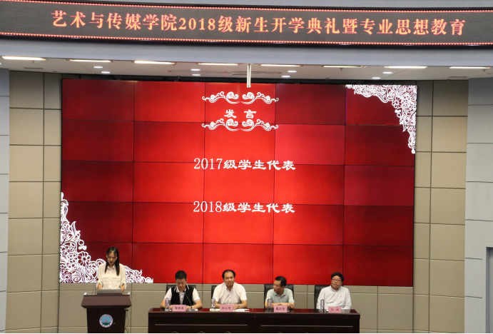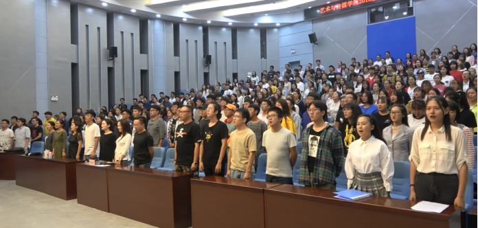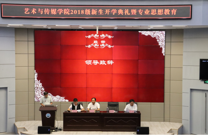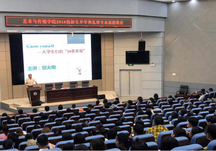 2018年9月29日晚19:00时,艺术与15vip太阳集团学2018级本科生开学典礼在校区学术报告厅举行。艺术与15vip太阳集团党委书记邹火明教授、常务副院长戴德铸教授、教师代表陈旗教授,2018级辅导员饶艳芹、史梦玲、赵湘以及全体2018级本科生参加大会。